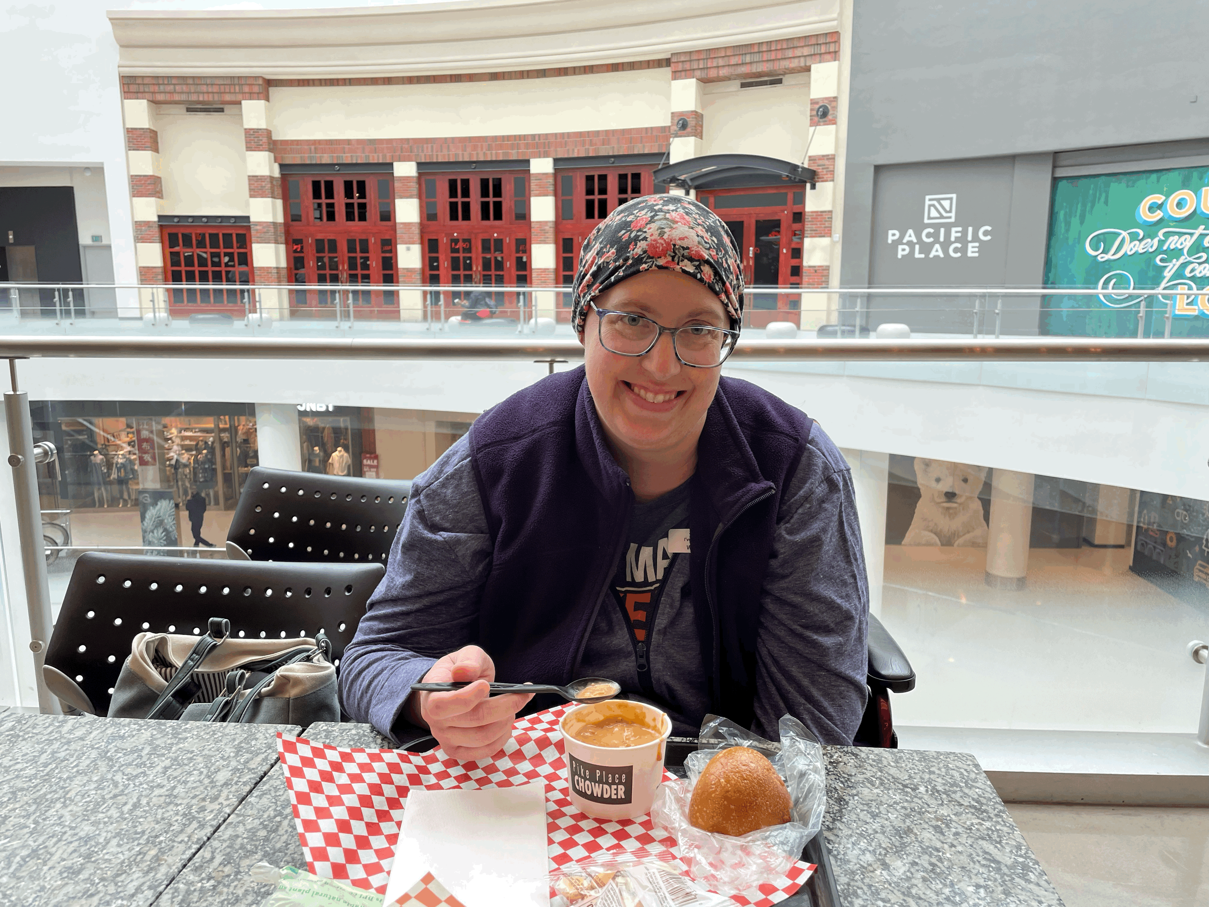 Steph had a craving for some chowder, so we stopped in at Pacific Place to get some Pike Place Chowder. Was nice to get out and about together for something other than a clinic visit.